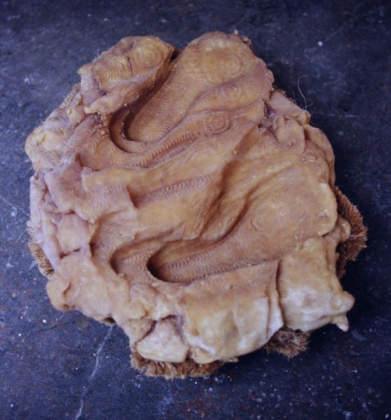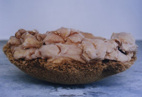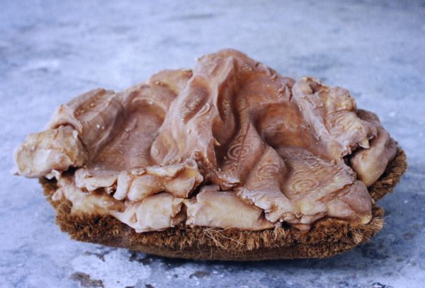 Bad-tempered-jumping on clay induced an instantly delighted state, the bounce on wet clay was very unexpected. The resulting mass was then preserved in rubber and concrete. The semi-spherical underside is surfaced by a bristled door mat. This is an argument with my tutor crystallised, he liked this work.